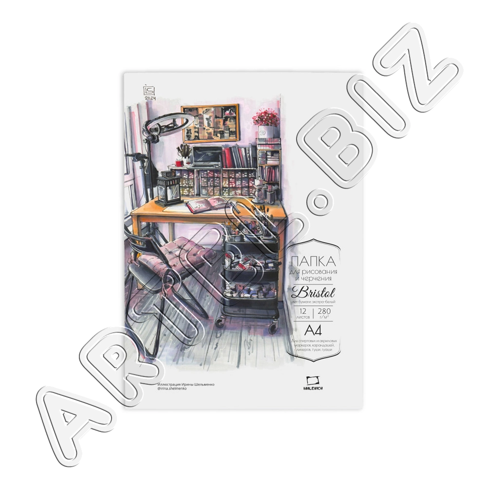 Папка с бумагой для графики и маркеров Bristol, 280 г/м2, А4, 12л., Малевичъ