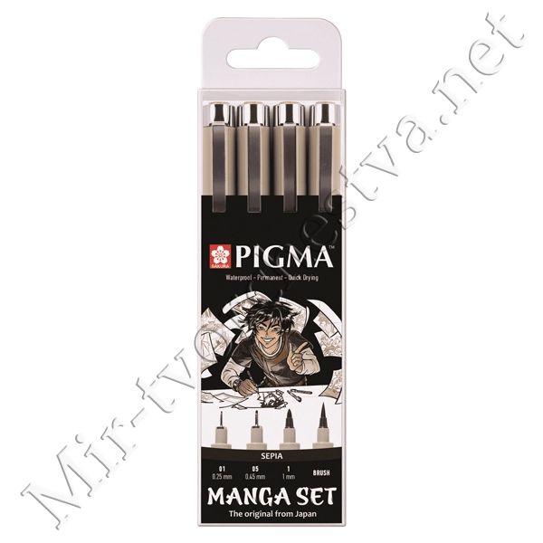 Набор капиллярных ручек Pigma Manga 4 штуки Сепия (0.25мм, 0.45мм, 1мм, кисть) в блистере, Sakura