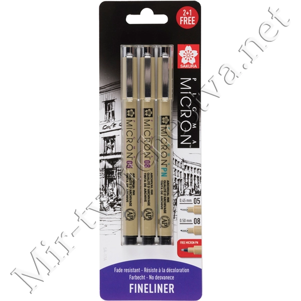 Набор капиллярных ручек Pigma (Micron 0.45мм, 0.5мм + PN, черные) 3 штуки в блистере, Sakura