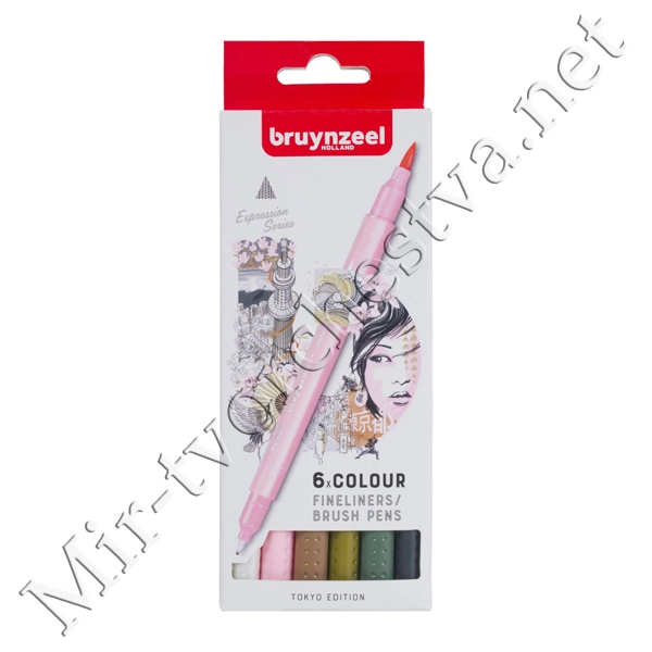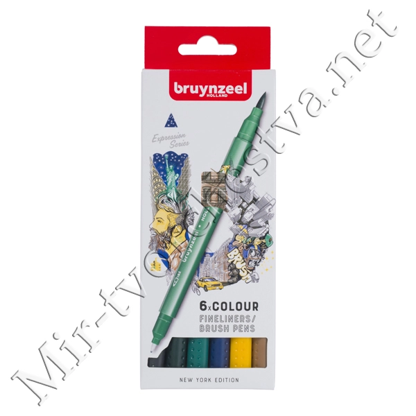 Набор двухсторонних капиллярных ручек Creatives New York (линер 0.4мм+кисть) 6 цветов в картонной упаковке, Bruynzeel
