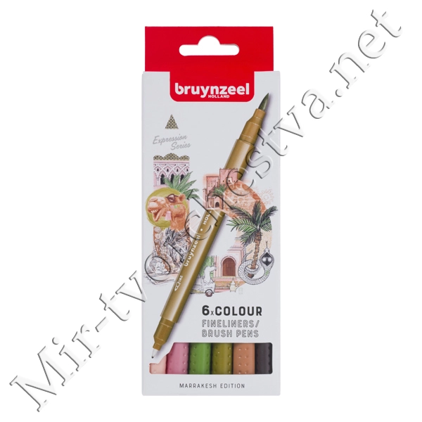 Набор двухсторонних капиллярных ручек Creatives Marrakesh (линер 0.4мм+кисть) 6 цветов в картонной упаковке, Bruynzeel