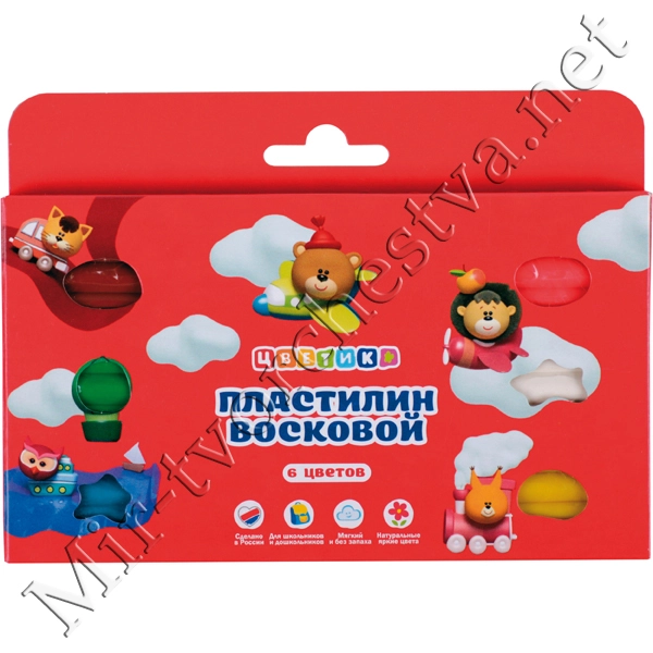 Набор пластилина воскового со стеком, 6 цветов, 90г, Цветик