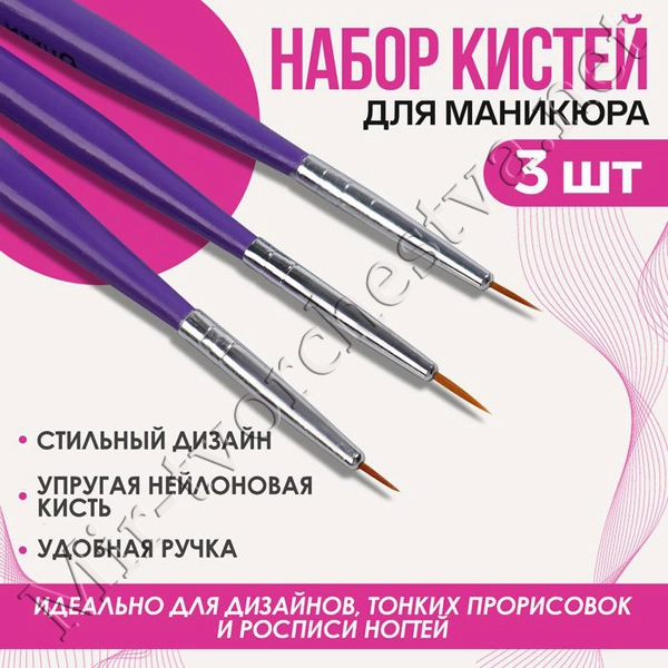 Набор кистей для дизайна ногтей, 3 шт, 13,5 см, цвет сиреневый/белый