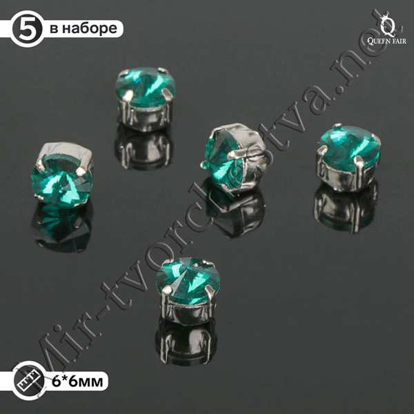 Стразы в цапах без отверстий (набор 5 шт), 6*6мм, цвет изумрудный в серебре