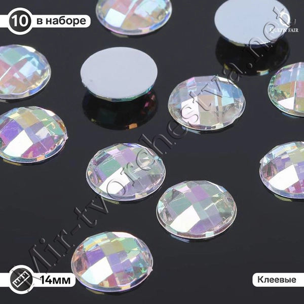 Стразы плоские клеевые круг, 14 мм, (набор 10шт), цвет радужный