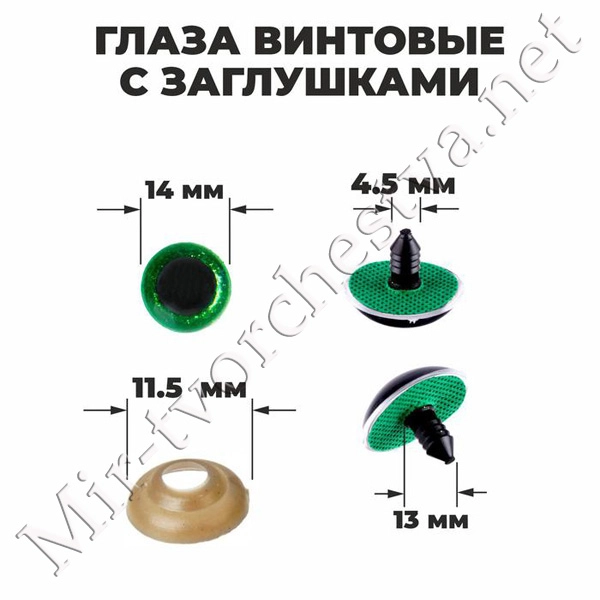 Глаза винтовые с заглушками, «Блёстки», размер 1 шт: 1,4 см, цвет зелёный