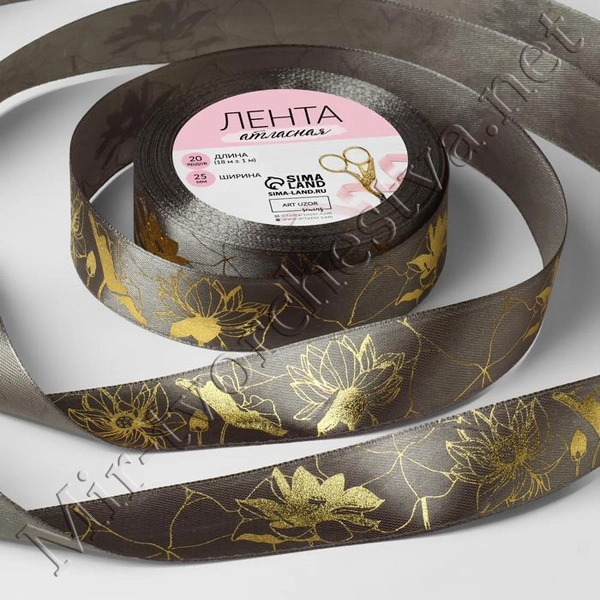 Лента атласная с тиснением «Лотос», 25ммx1м, цвет Тёмно-серый/Золотой №189