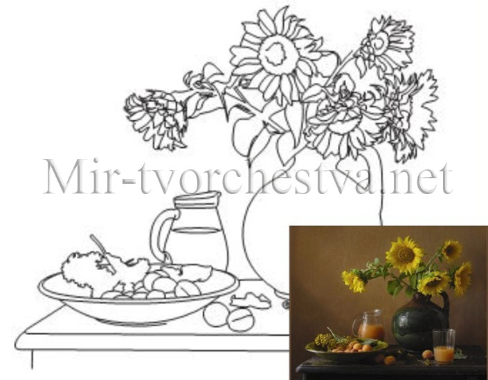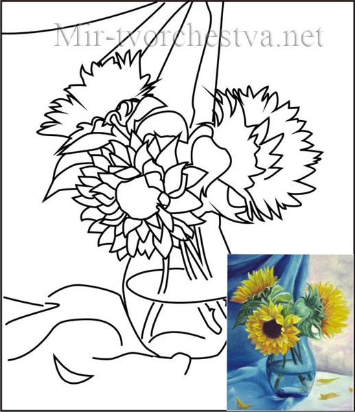 Холст на картоне с контуром, Ваза с подсолнухами, 30х40 см, Сонет